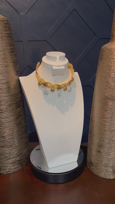 DETAILS: This 14k-gold plated sea pearl choker necklace features an extravagant floral design with intricate details and luxurious gemstones. Suspended circular pendants alternate with precious teardrop sea pearls and Swarovski crystal-embellished accent flowers; that adorn this open cuff choker structure.